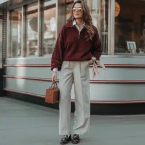 The combination of a classic button-down shirt and a knit vest is a timeless pairing that effortlessly marries style with comfort. The crisp, clean lines of the shirt create a polished look, while the knit vest adds a cozy layer that’s particularly appealing in fall. Opting for rich hues like burgundy not only adds a touch of warmth but also visually enhances the outfit against neutral pants. This ensemble works wonders for those over 60 by showcasing a chic silhouette while providing versatility—perfect for transitioning from day to evening. The loafers add a modern touch, maintaining comfort without sacrificing style.