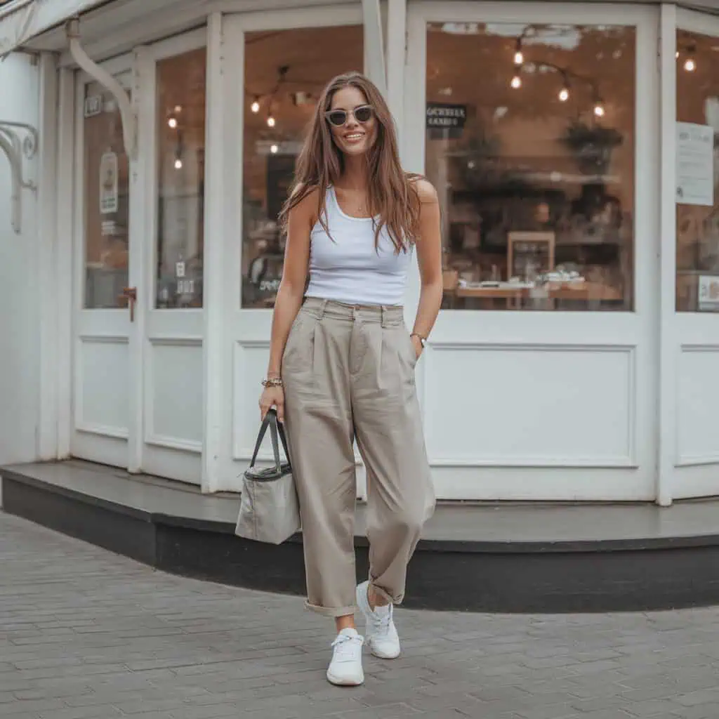 Linen trousers are a summertime staple, and pairing them with a relaxed-fit tank top creates an effortlessly chic ensemble that’s perfect for warm weather. The high-waisted design of the beige trousers elongates the legs while offering a breezy vibe that’s hard to resist. Tucking in the tank top helps to define the waist, showcasing your figure without sacrificing comfort. White sneakers add a casual touch, making this look suitable for leisurely strolls or casual outings. Minimalist sunglasses and understated jewelry keep the focus on the outfit itself rather than the accessories. This combination of relaxed yet put-together pieces highlights the beauty of simplicity, allowing you to feel both chic and comfortable all day long.