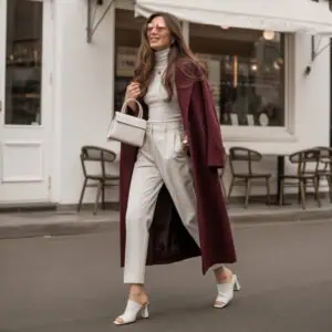 A belted coat serves as an amazing layering piece that defines the waist and makes it a standout. Choosing an olive green hue adds a touch of earthiness, which works beautifully with bold hues or monochromatic outfits. When paired with slim-fitting pants, the outfit creates a seamless silhouette that emphasizes your shape while remaining chic. The block-heel boots provide support and elevate your look, making it polished enough for any setting. Accessories like cat-eye sunglasses and a structured handbag bring a sophisticated flair—it’s all about that refined balance between comfort and style.