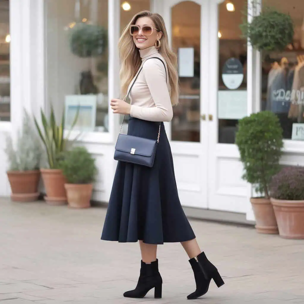 The turtleneck is a friend to curvy figures, providing a form-fitting, sleek look that accentuates the neckline and elongates the torso. When paired with an A-line skirt, the result is an hourglass silhouette that flatters your curves without feeling constricted. The flared nature of the skirt subtly drapes over the hips, allowing for movement and comfort while creating a beautiful contrast with the fitted top. Choose a vibrant color for the skirt to inject a playful vibe into your outfit, and finish with heeled boots to elevate your posture and lengthen your legs. Accessories like oversized sunglasses and gold bangles can add a touch of glamour, amplifying your confidence as you embrace this chic balance.