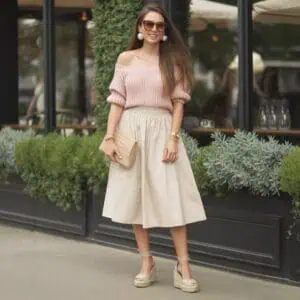 Midi A-line skirts are timeless pieces that beautifully accentuate your curves while keeping the ensemble lively and fresh. When styled with a fitted knit cardigan tucked in, this look achieves an airy and feminine vibe that celebrates your individuality. The playful texture of the cardigan adds warmth, while kitten heels lend just the right amount of lift for effortless elegance. Pairing this with a woven handbag introduces organic materials, enhancing the vintage charm. The effortlessly chic round sunglasses and minimal silver earrings add a touch of sparkle, embracing the nostalgia of past fashion trends with the ease of modern styling.
