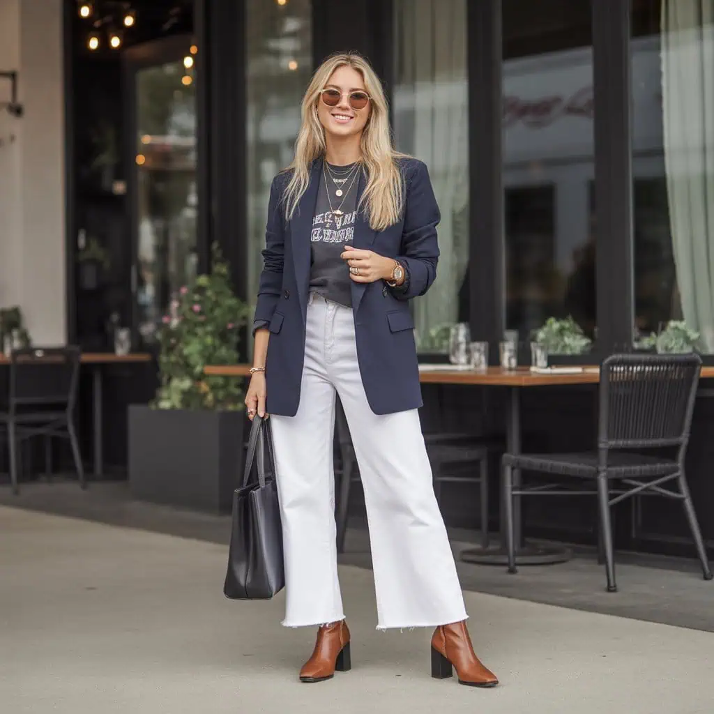 The combination of white jeans and a navy blazer is a quintessential way to fuse casual and refined elements in your wardrobe. The classic navy blazer brings structure and sophistication, transforming simple jeans into a more tailored look perfect for professional settings or smart-casual outings. Pairing it with a graphic tee injects personality and a modern twist into the mix, showing off your unique style without opting for overly formal attire. The brown heeled ankle boots add just the right amount of edge, while layered gold necklaces offer a touch of glam that ties the entire outfit together effortlessly. This look embodies versatility, making it suitable for work and social engagements alike.