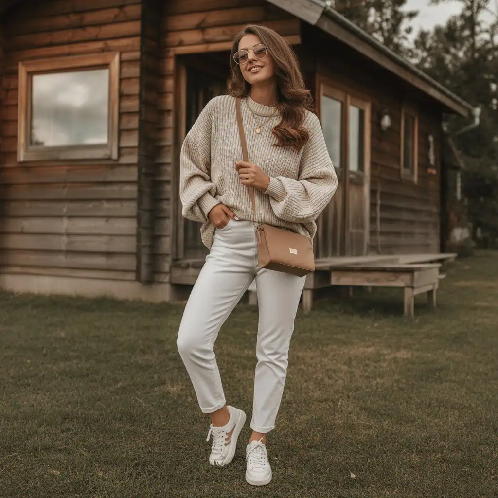 Opting for white jeans paired with a chunky winter knit creates an effortlessly cozy vibe that’s perfect for colder months. The contrast of the crisp white denim against the rich textures of a thick, oversized sweater not only keeps you warm, but it also introduces a fresh take on winter fashion. This combination works beautifully because it balances comfort and style; the softness of the knit complements the sleekness of the jeans, while the weighty fabric takes the winter chill into account. Complete the look with white sneakers for a carefree, casual aesthetic, making it ideal for everything from coffee dates to weekend getaways.