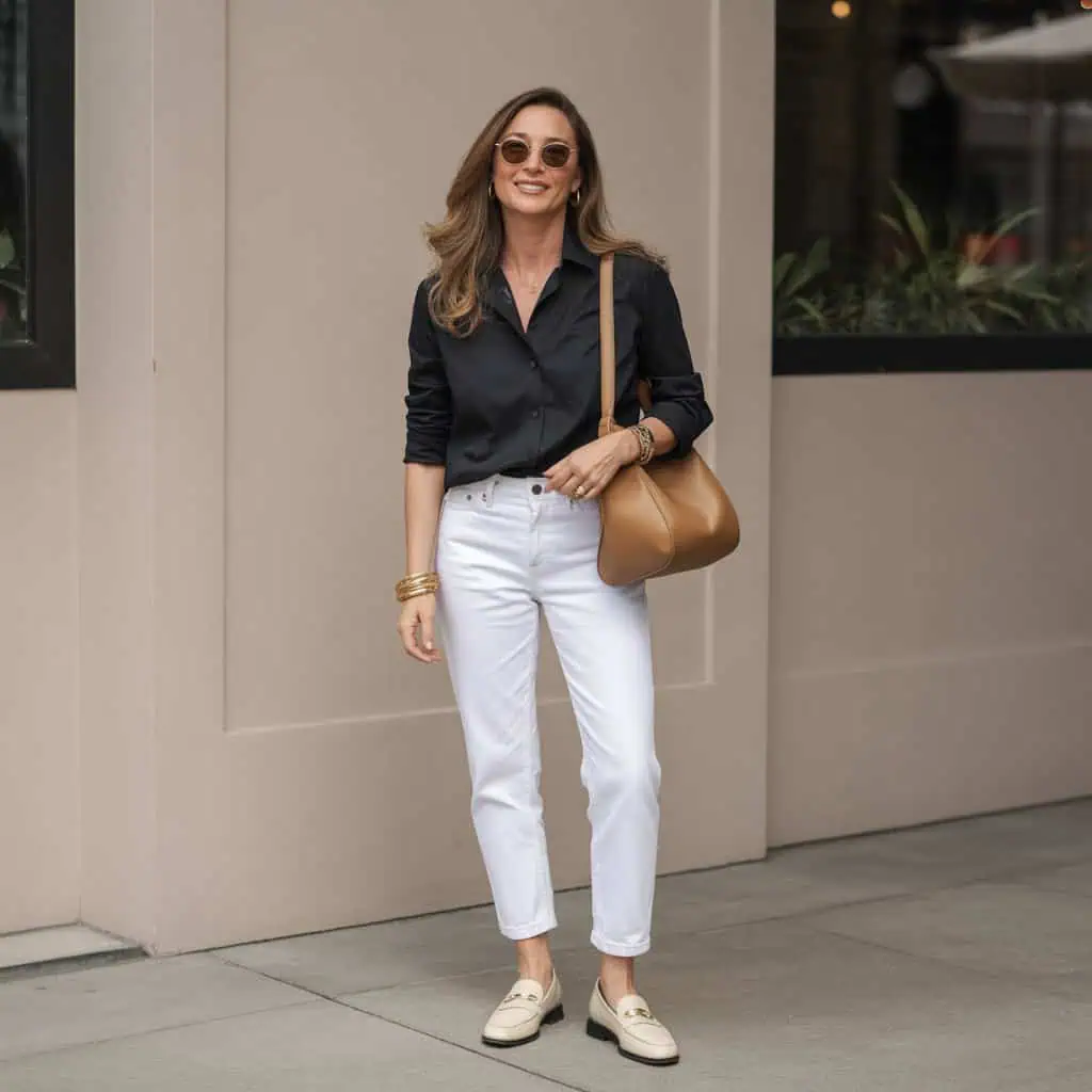 Pairing white jeans with loafers elevates casual wear into a sophisticated ensemble that’s effortlessly chic. The contrast between the crispness of the jeans and the polished nature of the loafers creates a balanced look perfect for various occasions. A navy blouse adds structure, seamlessly transitioning this outfit from day to night. Gold bangles introduce a touch of elegance without overwhelming the overall vibe. Oversized sunglasses not only makes a statement but also allow for a touch of mystery, rounding out a look that exudes confidence and style—ideal for brunch or a casual meeting.