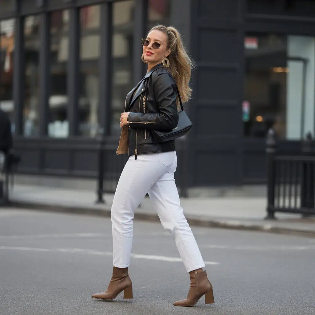 White jeans and a leather jacket create a striking contrast that exudes cool confidence. The crispness of the jeans juxtaposes beautifully with the rugged texture of the leather, creating an outfit that’s both modern and timeless. This duo is perfect for those “I want to look put-together but still edgy” moments. The fitted leather jacket brings structure and form, while opting for sleek ankle boots adds an element of sophistication. Don’t forget chic gold hoop earrings to lend just the right amount of glam. This ensemble is versatile enough for a casual day out or a night on the town, proving that white jeans aren’t restricted to warmer months.