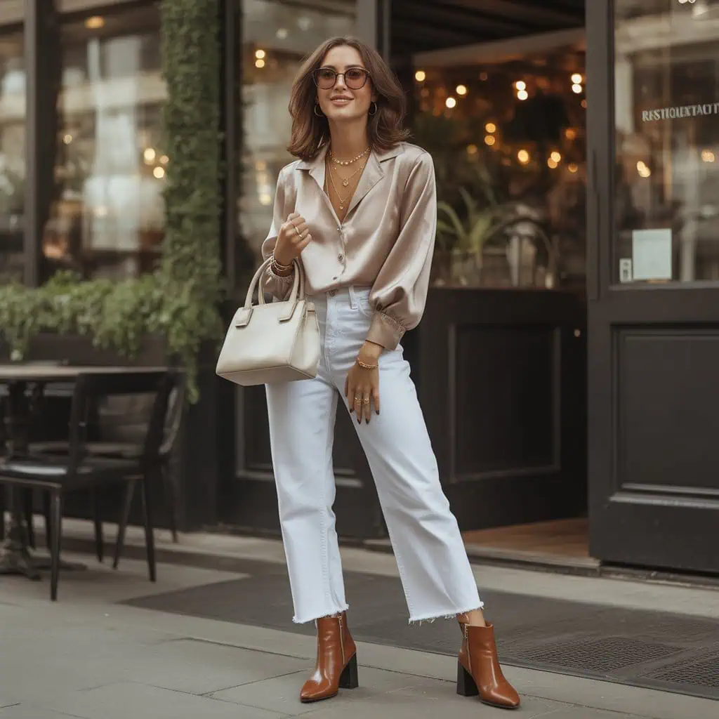 Pairing white jeans with a luxurious silk blouse creates an effortlessly chic look that radiates elegance. The buttery fabric of the blouse adds a touch of sophistication, while the white denim keeps it grounded and fresh. This combination strikes the perfect balance between casual and polished. Opt for soft, muted colors or subtle prints in your blouse for an easy transition through seasons. Accessorizing with delicate layered necklaces and oversized sunglasses amplifies the overall aesthetic, making it suitable for anything from brunch to a stylish evening out. The structured cream handbag ties the look together, adding a refined edge that ensures you always step out stylishly.