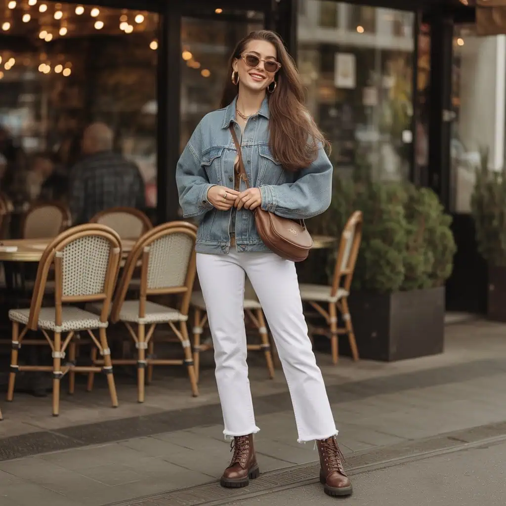 The timeless appeal of pairing white jeans with a denim jacket creates a classic yet edgy outfit that never goes out of style. The oversized denim jacket offers a relaxed fit, perfect for layering and enhancing the overall silhouette. Brown lace-up combat boots introduce a touch of urban edge, making the look effortlessly cool. Gold hoop earrings and oversized sunglasses add that trendy finish, highlighting the outfit’s fun and adventurous spirit. This ensemble is ideal for transitioning seasons, effortlessly maintaining comfort and style while remaining versatile for any casual occasion.