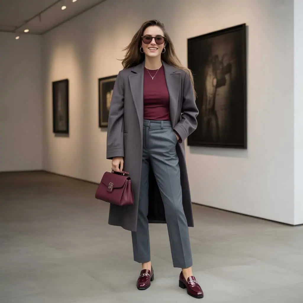 The Gray + Burgundy pairing is a timeless mix of refinement and warmth. A tailored gray coat sets the foundation, adding sleek structure to the look, while a fitted burgundy top underneath introduces a bold pop of rich fall color. Smart gray trousers keep the palette cohesive and elongate the silhouette, creating a polished balance. Burgundy loafers tie the outfit together, offering both sophistication and comfort. To complete the ensemble, gold jewelry and a structured bag add just the right touch of elegance, making this outfit ideal for a modern city-ready look.