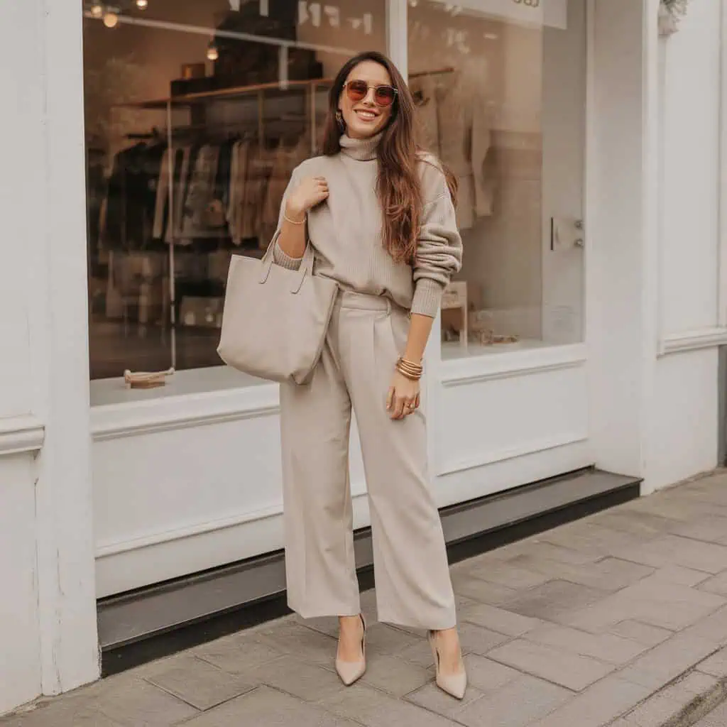 Monochrome dressing might sound simple, but it’s one of the most sophisticated ways to showcase your style. Sticking to neutral tones creates a harmonious look that feels effortlessly chic. In this outfit, the creamy tones of the wide-leg trousers and matching turtleneck elongate the body, offering a streamlined effect that flatters every figure. Pairing them with cream pumps accentuates this elongation, while gold accessories invite just the right amount of sparkle into the minimalist palette. The sunglasses and structured bag add interest, allowing your outfit to feel cohesive yet dynamic. This formula is perfect for making a subtle statement while remaining comfortable and chic, proving that simplicity can indeed be striking.