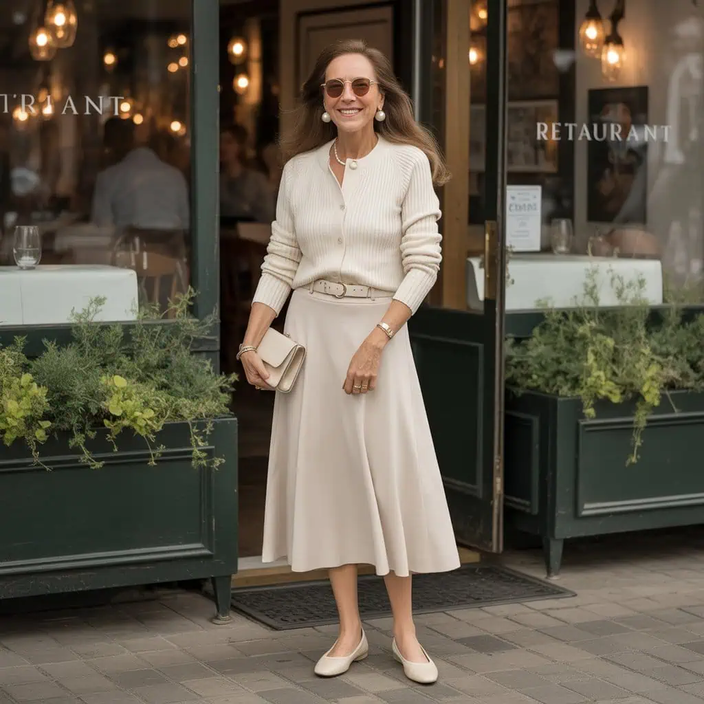 There’s something incredibly chic about a monochrome knit set, especially when it balances comfort with sharp style. This look draws the eye while remaining undeniably wearable, with a fitted knit top and a matching belted midi skirt that create a graceful, elongated silhouette. A cream-toned palette feels fresh and sophisticated, making it a perfect choice for various casual occasions. The tan flats add a subtle earthy contrast while ensuring all-day ease. Finishing touches like a dusty rose tote and layered necklaces inject personality into the outfit—an effortlessly elegant choice that radiates confidence and quiet sophistication.