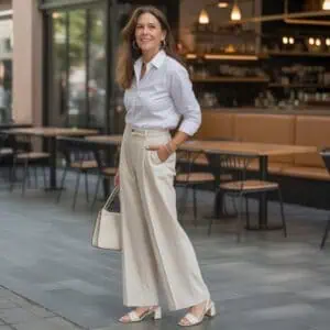 A classic white button-down shirt is the ultimate versatile piece, and when paired with wide-leg trousers, it transforms into a statement of elegance and ease. The crispness of the top juxtaposes beautifully with the flowy silhouette of wide-leg pants, making it perfect for any occasion, from brunch to a gallery opening. Tucking the shirt in defines the waist and adds shape, while the effortless comfort of the wide-leg style allows for movement without sacrificing style. Complete this clean look with soft ballet flats for comfort and a sleek clutch that adds a touch of color, ensuring you embody effortless sophistication.