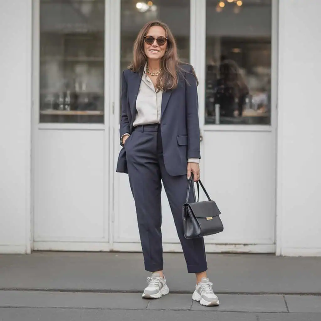 A tailored blazer and straight-leg trousers blend sophistication and ease, creating an effortlessly chic silhouette. The structured lines of the blazer add a polished finish, while the straight-leg trousers elongate the legs, flattering every figure. This ensemble is all about balance: the blazer brings sharpness, and the soft beige blouse keeps it approachable. By opting for dark tones with a pop of color in accessories like white sneakers and black bag you maintain a refined yet dynamic look. This combination is a wardrobe essential that conveys confidence and style, proving that elegance knows no age.