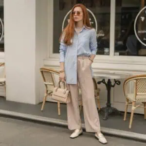 The classic combination of pleated trousers and a crisp cotton poplin shirt is always a winning choice. The pleats gently flatter the silhouette while allowing for ease of movement, making them great for long trips. Tucking the shirt in lends a sophisticated edge, enhancing the overall polished look. Introducing a lightweight blazer adds an element of refinement and extra warmth, making it ideal for both chilly terminals and cozy in-flight climates. Drape the blazer over your shoulders for a relaxed yet put-together feel, and white sneakers keep the outfit grounded while ensuring comfort.