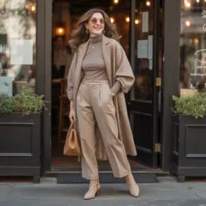 Embrace the power of monochrome with a turtleneck and tailored trousers layered under a striking camel coat. This approach not only streamlines your silhouette but also allows for versatility through textures and shades. The cream turtleneck contrasts beautifully with the soft taupe trousers, creating an elegant flow that makes you look effortlessly put together. The tailored camel coat gives a polished finish, while beige heeled boots subtly elongate the legs. Complement the outfit with tortoiseshell sunglasses and understated jewelry for a refined touch that feels cohesive without sacrificing personality.