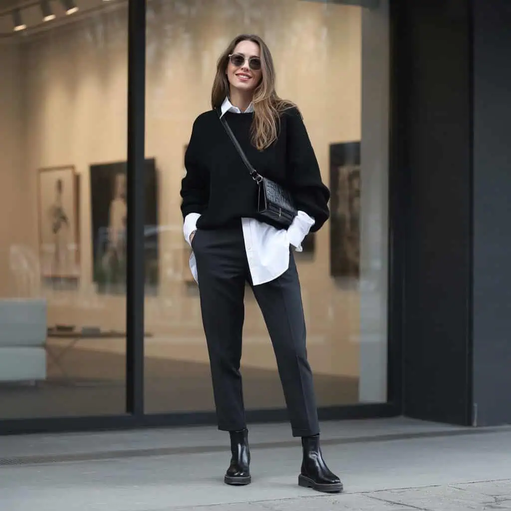 Layering a black sweater over a crisp white button-down is an effortless way to introduce some depth to your outfit. This combination juxtaposes the structured buttons of the shirt with the relaxed fit of the sweater, creating visual interest and a stylish contrast. By pairing it with tailored pants, you ensure comfort without sacrificing sophistication. This look is not only smart but versatile; perfect for a day at the gallery or meetings, the ensemble is a great canvas for your creativity. Accessorizing with a structured crossbody bag and chic sunglasses pulls it all together, helping you transition seamlessly from day to night while looking effortlessly put together.