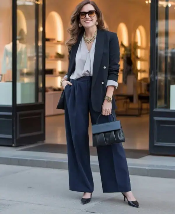 Wide-leg trousers are a fantastic choice for creating a fashion-forward ensemble that combines ease with elegance. This silhouette flatters all body shapes by providing ample room and elongating the legs—perfect for maintaining a relaxed yet refined vibe. Pairing these trousers with a well-fitted round-neck waistcoat tucks in at the waist, accentuating your figure while delivering a tailored appearance. Stick to a classic palette, like navy and white, for a timeless aesthetic. Adding pointed heels will give you that extra boost and polish, while a sleek handbag ensures your ensemble feels sophisticated and complete.