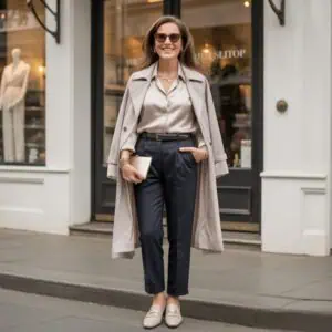 There’s something timeless and effortlessly chic about a belted trench coat, particularly in a rich navy hue. It not only defines the waist but also adds a polished touch to any ensemble, making it a standout choice for the 50+ crowd. Layering it over a crisp white blouse tucked into tailored black trousers strikes a perfect balance between structure and softness. The kitten heels introduce a practical yet stylish lift, ensuring you feel at ease. A versatile tote bag completes the look while the understated jewelry pieces whisper sophistication. This outfit is perfect for exuding confidence while remaining effortlessly stylish.