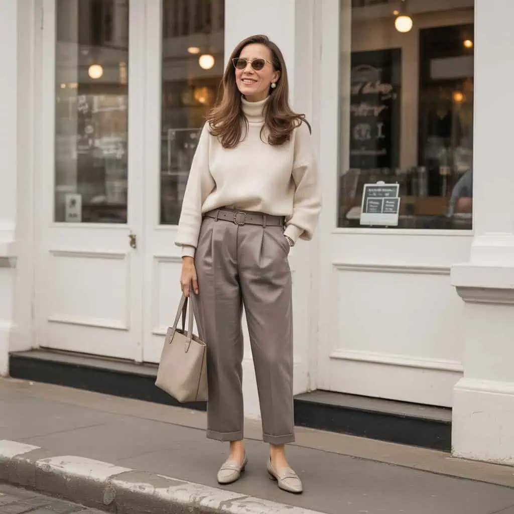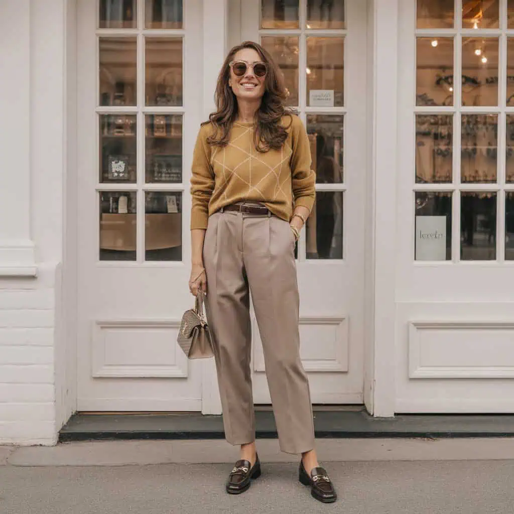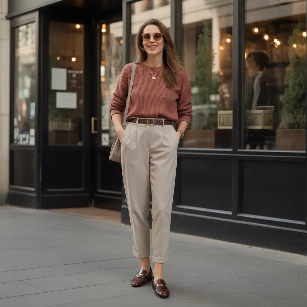 Opting for a fitted knit rather than a bulky sweater introduces a flattering silhouette that enhances your figure and exudes effortless elegance. A rust-colored knit adds warmth and vibrancy, perfect for those fall palettes, while tucking it into tailored beige trousers creates a streamlined look that elevates your ensemble. The slim belt draws attention to your waist, promoting a tailored appearance. Pairing this outfit with classic loafers maintains comfort without sacrificing style, and the structured crossbody bag keeps everything chic and practical. Oversized sunglasses and minimal gold jewelry offer the right finishing touches that elevate your style, proving that simplicity is often the key to sophistication.