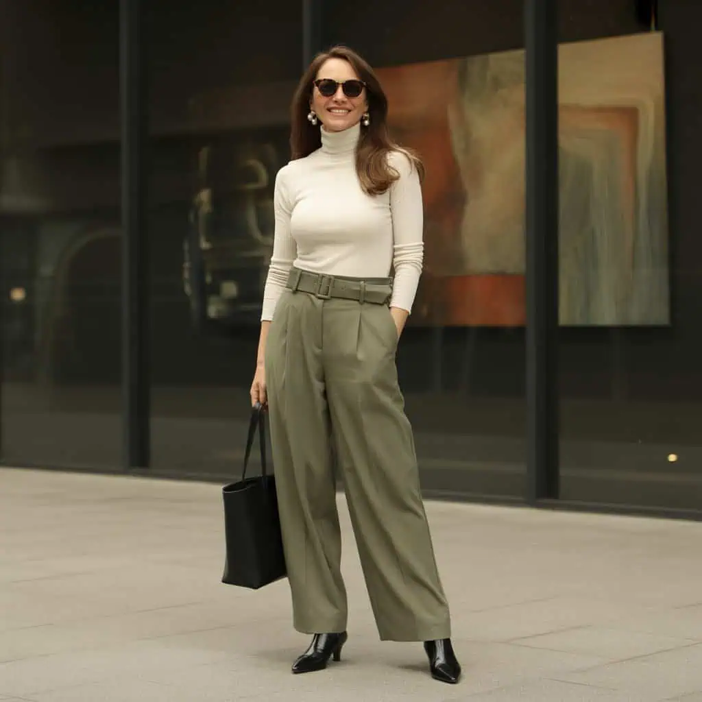 Ankle boots with sleek lines are a game changer for fall footwear. They not only provide stability but also lend a contemporary edge to your outfit. Low kitten-heel designs elevate your height just enough without compromising comfort, making them a perfect everyday go-to. When paired with tailored olive wide-leg trousers and a smart cream turtleneck, this footwear option balances out proportions beautifully while adding sophistication. The addition of a sleek black tote bag enhances the overall polished vibe, while dark sunglasses and delicate pearl earrings maintain a sense of understated elegance. This combination effortlessly transitions from day to evening, proving that style should always be effortless.