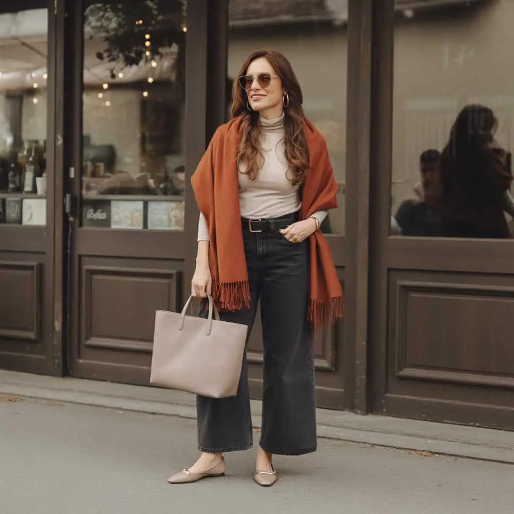 Fall presents a splendid opportunity to play with textures and colors, especially through the use of scarves. Embracing rich autumn tones like burnt orange adds warmth and vibrancy to your outfit, instantly elevating your look. The color complements the earthiness of the season and works harmoniously with neutrals like beige and darker hues. By draping a scarf softly around your shoulders, you not only add a touch of elegance but also provide a cozy layer that enhances your silhouette. Keep the rest of the ensemble simple, allowing the scarf to be the star while supporting your personal style with chic accessories and comfortable footwear.