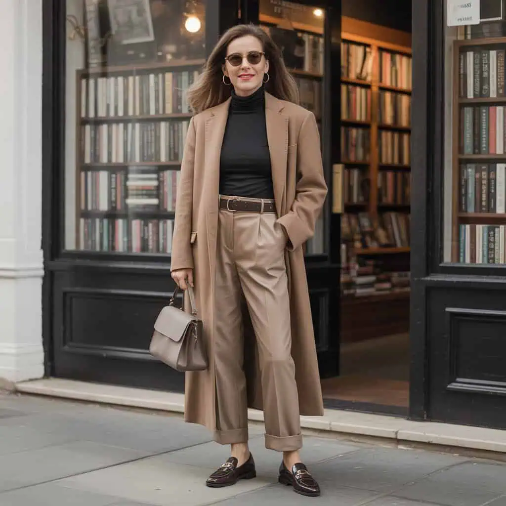A well-structured leather bag is a timeless investment that can instantly elevate any outfit. The clean lines and refined silhouette of a leather tote provide sophistication and practicality—a perfect combination for women who appreciate style and functionality. A structured bag not only grounds your look but also balances out more relaxed pieces, like a draped cardigan or wide-leg trousers. Opting for warm, deep hues like brown, navy, or even forest green adds a classic touch that’s perfect for the season. This accessory not only carries your essentials with ease but becomes a statement piece that reflects your polished style and mature sensibility.