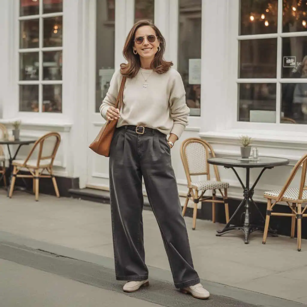 Dark denim is your friend when it comes to versatile yet polished casual wear. Choosing straight or wide-leg cuts creates a refined look, which can effortlessly transition from day to night. The deeper hues of dark denim offer a slimming effect and can be paired easily with various colors and textures, making it a wardrobe staple. Tucking in a cozy knit sweater emphasizes the waist and adds a layer of comfort, while loafers enhance the laid-back vibe. With understated accessories, such as silver earrings and a chic shoulder bag, you achieve a look that is effortlessly stylish and ready for any occasion—perfect for those who appreciate fashion that reflects their personality.