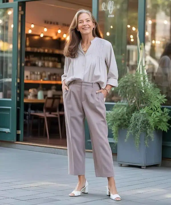 Straight-leg pants deliver a classic, sophisticated appeal that skinnies sometimes struggle to provide as we age. The straight silhouette offers a balanced look, providing structure without clinging too tightly to the leg, which allows for more freedom of movement. Pairing these trousers with a soft cream blouse tucked in enhances your shape while also introducing a modern touch. Ballet flats add subtle femininity and are an excellent choice for all-day wear. A chic satchel bag serves both utility and style, completing the outfit without clutter. This interpretation of tailored comfort is ideal for women who wish to feel both stylish and effortlessly put-together.