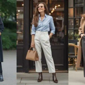 Black trousers are quintessential to a refined wardrobe, offering a polished appearance without sacrificing comfort. Opting for tailored trousers ensures a flattering fit that can adapt to various styles seamlessly. By tucking an ivory blouse into the trousers, you introduce a light contrast that elevates the whole ensemble. The pointed-toe ankle boots not only extend the leg line but also inject a touch of edginess into the look. To finish it off, go for oversized sunglasses and a structured handbag to maintain an aura of sophistication and confidence, making this outfit suitable for everything from the office to after-work events.