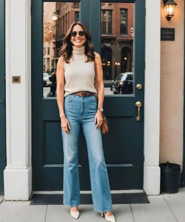 Layering adds depth and sophistication, and a tailored blazer achieves just that, especially for women over 60. The lightweight gray blazer over a cream turtleneck creates a beautiful contrast, harmonizing warmth and style. This combination flatters a range of body types while offering structure that enhances your silhouette. By incorporating straight-leg trousers, you maintain a polished, elongated look that’s timeless yet modern. Accessories like delicate jewelry and a structured handbag serve as perfect finishing touches, adding a touch of chic flair while ensuring comfort and ease in daily activities.