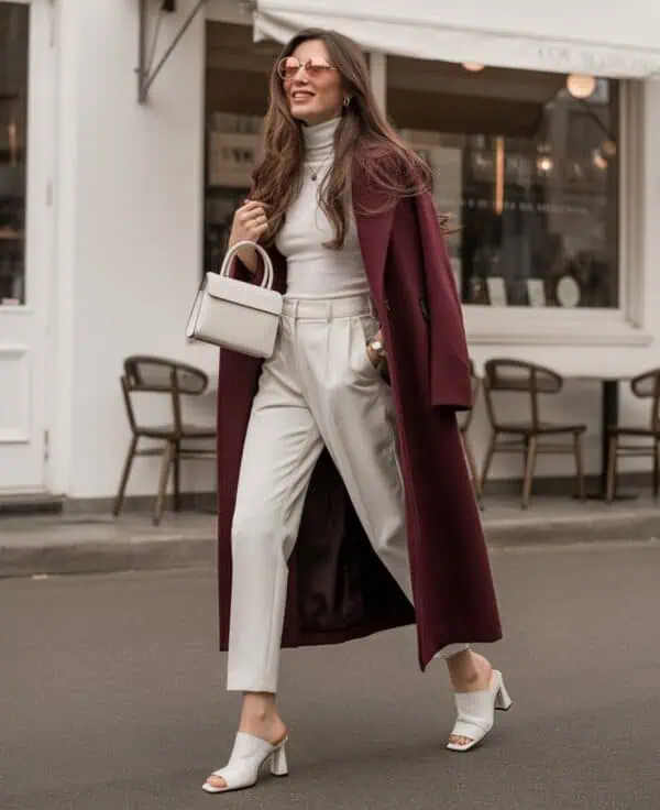 Imagine strolling through your day cocooned in the comforting softness of a neutral sweater. The way it seamlessly contrasts with tailored cream trousers creates a visual balance that’s effortlessly chic. This outfit exudes an air of elegance while keeping the vibe relaxed. The taupe heeled ankle boots add a polished touch without overshadowing the outfit’s laid-back essence. A neutral-toned scarf draped casually around the neck introduces an element of sophistication, while thoughtful accessories like pearl earrings enhance the overall cohesion, making you look put-together yet comfortable.