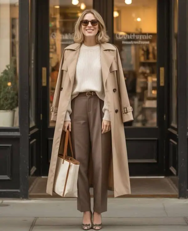 Tailored ankle pants serve as a sleek foundation that elevates any outfit. Paired with a fitted cream sweater, this combination strikes a perfect balance between structured and relaxed. The high-waisted nature of the pants elongates the legs, while the fitted top accentuates the waist, ensuring a flattering shape. Brown leather mules and oversized sunglasses enhance the overall sophisticated look, while the structured taupe handbag introduces a chic, modern touch. This ensemble works beautifully for transitional seasons, allowing for layering without compromising style. It encapsulates a smart-casual vibe that can effortlessly transition from art gallery mornings to evening gatherings.