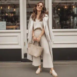 Mastering the art of understated elegance involves curating minimal accessories that make a significant impact. In this ensemble, an off-white knit sweater pairs beautifully with light gray pants for a visually appealing yet soft palette. The nude low heels and blush pink crossbody bag add a touch of warmth while maintaining a clean silhouette. Rose-tinted oversized sunglasses give a modern edge, while dainty gold earrings introduce a hint of sparkle without overwhelming the look. This outfit embodies the belief that less is more, allowing the classic pieces to shine and create a sophisticated aura perfect for any urban adventure.