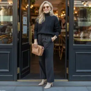 Oversized faux fur coats can exude luxury, but the key lies in balance. A softly draping faux fur in a classic nude shade acts as a versatile statement piece, effortlessly harmonizing with streamlined black pants. The structured silhouette of the trousers balances the bulk of the coat, ensuring that the overall look feels sophisticated rather than overbearing. Pairing this ensemble with chic heeled boots elongates the legs, while accessories like statement gold earrings and cat-eye sunglasses add a modern twist without overwhelming the outfit. This carefully curated blend creates a refined yet fashionable aura, ideal for any mature woman’s wardrobe.