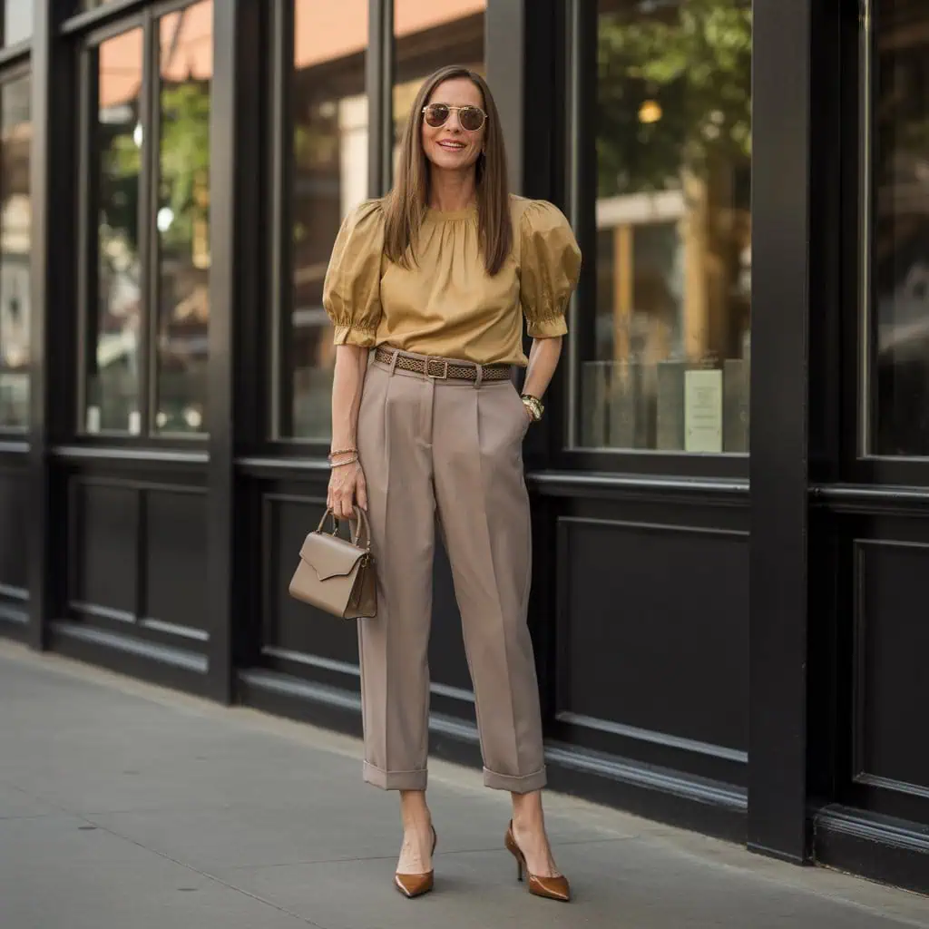 While puffy sleeves can add a fun flair to an outfit, they can often overwhelm the frame as we age. Instead of going for exaggerated silhouettes, try opting for tops with subtle details like a slightly puffed shoulder or delicate ruffles. This way, you can achieve a similar effect that draws the eye without adding unnecessary bulk. Pairing the top with a sleek, belted trouser helps define your waist and balance the volume on top. Keep the rest of your accessories simple and sophisticated, allowing the refined details of your outfit to shine through without stealing the spotlight.
