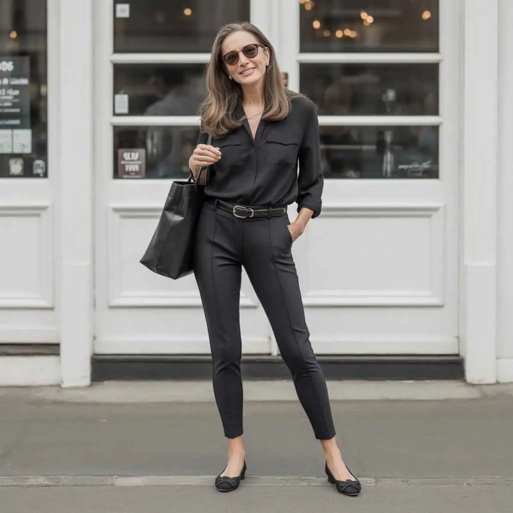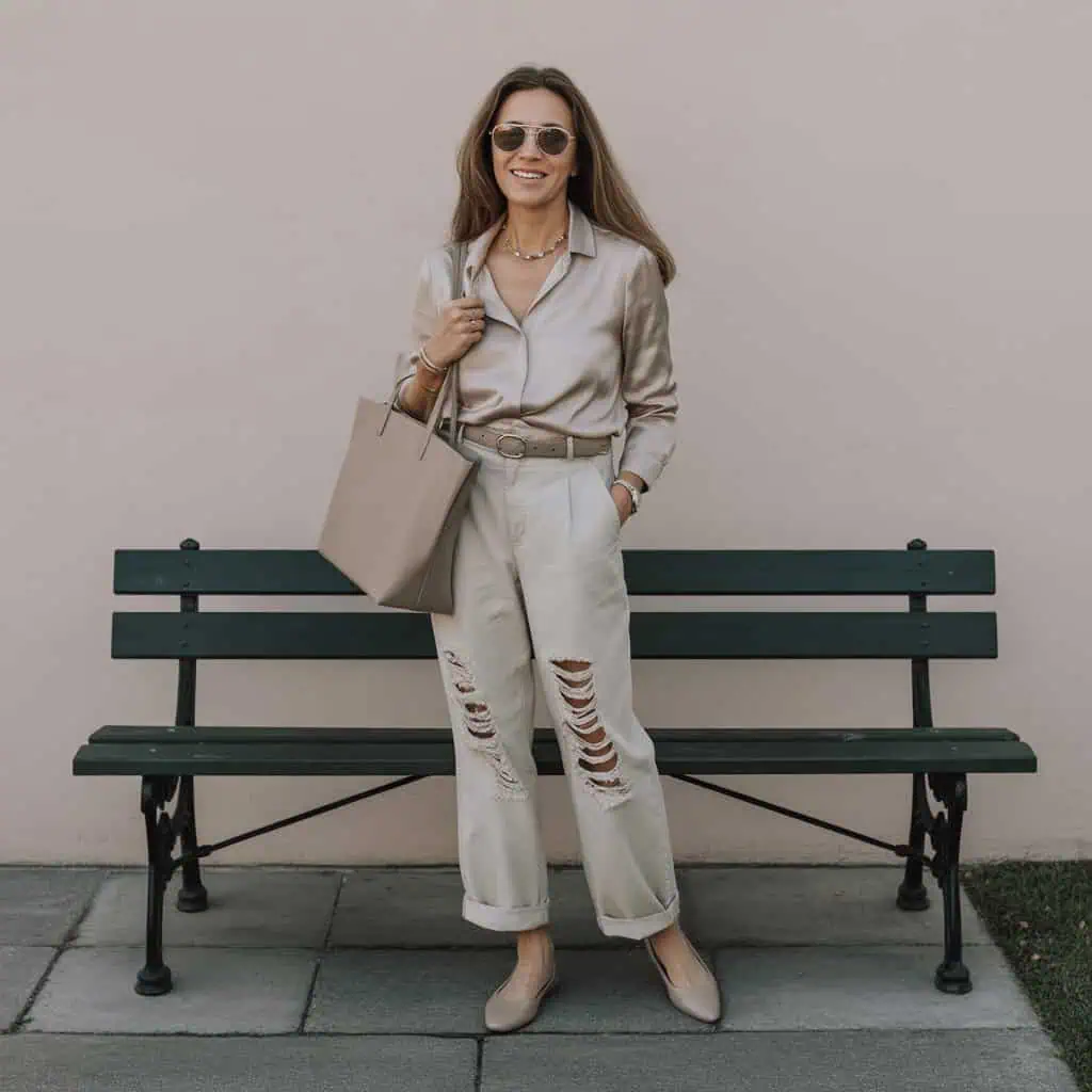 While denim remains a staple in any wardrobe, extreme distressing can often skew youthful instead of timeless. However, opting for a lightly distressed pair can blend modern flair with sophistication. A pair of neutral-toned, subtly frayed trousers can be effortlessly styled. Pair them with a tailored tucked-in blouse for a polished touch, and cinch them at the waist with a chic belt to define your silhouette. The addition of ballet flats keeps the look comfortable yet elegant. A structured tote bag serves as a functional yet stylish accessory, while aviators and minimal jewelry add a dash of understated glam, providing balance to the entire ensemble.
