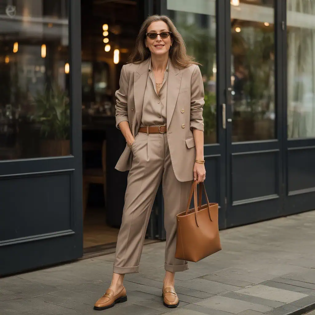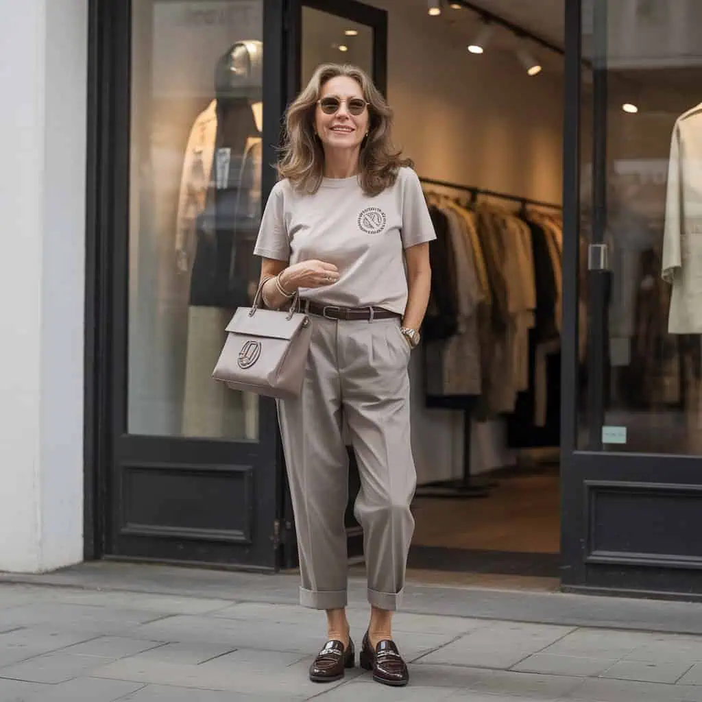 While it’s tempting to sport bold logos, an overly branded outfit can often feel excessive and detract from your overall style, especially as we embrace sophistication with age. Instead of flashy logos, opt for classic pieces that feature subtle branding or no logos at all. This creates a timeless appeal that aligns beautifully with polished loafers and tailored trousers. A belted trench coat adds a touch of sophistication, while round sunglasses keep things playful yet refined. Minimal jewelry amplifies elegance without competing with your outfit. Quality over quantity ensures a look that remains effortlessly chic.