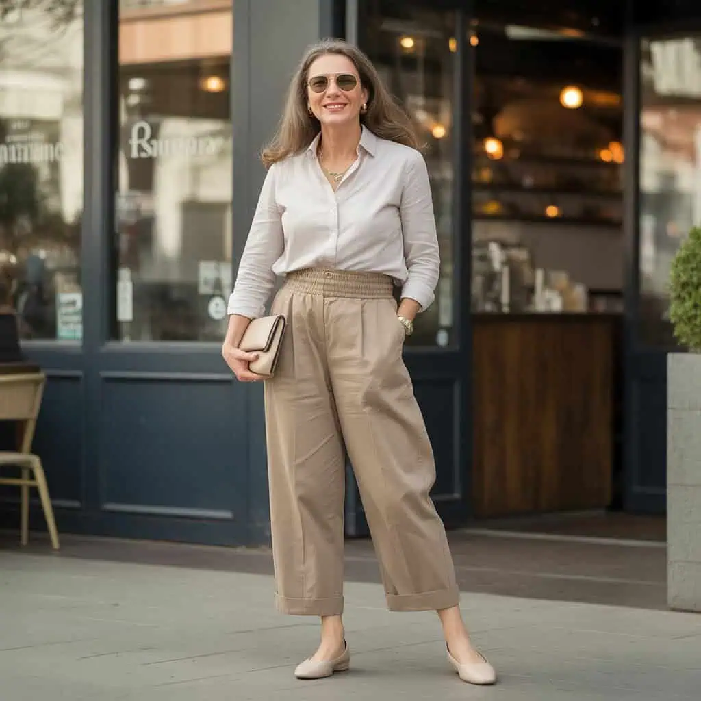 Comfort is key, but bulky elastic waistbands can detract from a polished appearance. Instead, look for tailored trousers with a more defined waistline or stretch fabrics that flatter your figure without adding unnecessary bulk. A well-fitted blouse tucked in can create a sleek shape and draw attention to your proportions. Ballet flats offer an easy yet stylish touch, making it perfect for casual outings. Elevate your look with a chic clutch and statement jewelry that shifts focus upward, ensuring your outfit remains balanced and sophisticated without compromising comfort.