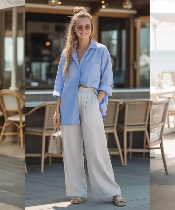 A crisp button-down shirt paired with tailored trousers is the epitome of polished elegance. This outfit strikes the perfect balance between professional and relaxed, making it ideal for both work and leisure. The fitted shirt tucked into the trousers creates a defined waist and emphasizes a clean silhouette, while the high-quality fabric exudes sophistication. Loafers elevate comfort without sacrificing style, and a chic satchel bag offers a practical yet fashionable touch. With cat-eye sunglasses adding a playful pop, this ensemble is effortlessly chic for any mature woman’s wardrobe, ensuring confidence with every step.