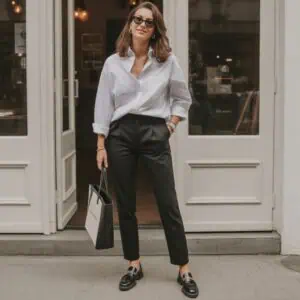 Pairing a classic button-down shirt with a cozy knit vest brilliantly marries tailored chic with comfort. This combination allows for layering without bulk, creating a streamlined appearance that’s both approachable and stylish. The oversized shirt introduces an element of ease, while the knit vest adds texture, ensuring you don’t sacrifice warmth for style. Tailored charcoal trousers elevate the look, grounding the ensemble with a touch of sophistication. Black leather Chelsea boots add an edgy flair, while accessory choices like layered gold necklaces and oversized sunglasses inject a trendy confidence. This outfit is ideal for any brunch date or casual meeting, proving that layering can indeed be a fashion-forward choice.