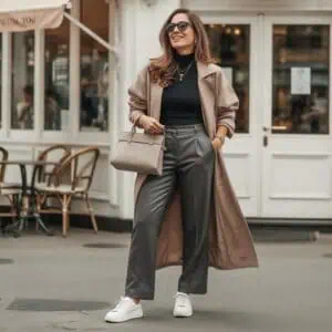 A coat-forward ensemble is a savvy practical choice that turns heads. Layering a slim-fit turtleneck dress under a tailored wool coat creates an elegant yet cozy outfit perfect for cooler days. The belted waist keeps the silhouette defined while offering a sleek appearance, enhancing your overall shape. Cognac ankle boots introduce a warm contrast that complements the muted tones, adding visual interest. Accessories like oversized sunglasses and a chic handbag bring sophistication to the look, making you feel as luxurious as you look. This outfit is ideal for transitioning from day to night with ease, ensuring you’re always runway-ready.