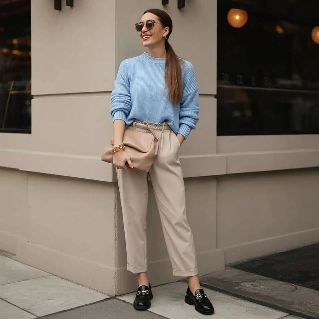 Embrace comfort and elegance with a lightweight sweater paired with paperbag-waist trousers. This combination pays homage to vintage styles while keeping things decidedly modern and fresh. The paperbag silhouette adds a flattering definition to the waist, while the flowing trousers provide the versatility needed for day-to-night wear. Buckled loafers ground the outfit with a dash of sophistication—you’ll appreciate how they transition seamlessly from casual coffee runs to office meetings. With the right accessories, like oversized round sunglasses and a sleek handbag, this look embodies an effortless, chic vibe that feels simultaneously nostalgic and contemporary.