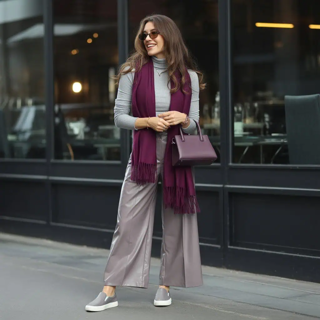 Embracing a monochromatic palette not only creates a sophisticated look but also allows for the perfect backdrop to showcase a bold pop of color. In this ensemble, the soothing greys set a serene tone, while the plum scarf introduces a rich, luxurious contrast that energizes the outfit. This deep hue adds depth, turning what could be a simple look into something memorable. The inclusion of matching accessories, like the plum handbag, pulls the whole look together, creating a harmonious balance that feels intentional and curated. Pairing with silver accents enhances the modern vibe, making it versatile enough for both day and night outings.