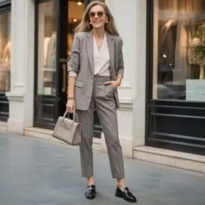 A wool blazer paired with straight-leg trousers is a go-to ensemble for an effortlessly polished look. This combination brings together professional sophistication and trendy flair, making it perfect for both work and casual gatherings. Opting for a grey wool blazer layered over a simple white blouse brings depth while maintaining a classic aesthetic. Straight-leg trousers offer a flattering fit that elongates the legs, while nude pointed-toe kitten heels add a touch of elegance and comfort. To finish, a beige tote bag and sophisticated accessories, like pearl earrings and oversized sunglasses, create a complete outfit that’s not only stylish but also exudes confidence—perfect for all seasons.