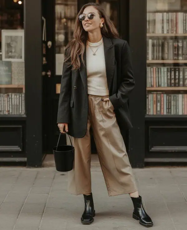 This outfit captures a modern, laid-back aesthetic that’s perfect for running errands or catching up with friends. The wool vest adds a layer of warmth without bulk, while high-rise pants provide a tailored feel that complements the vest’s relaxed vibe. Choosing wide-leg pants not only enhances comfort but also creates a striking visual contrast against the slim profile of the vest. Pairing this look with white sneakers keeps it grounded and effortlessly cool, bridging the gap between casual and chic. A cream crossbody bag and minimal gold studs add lighthearted touches, ensuring that you look stylish without sacrificing comfort.