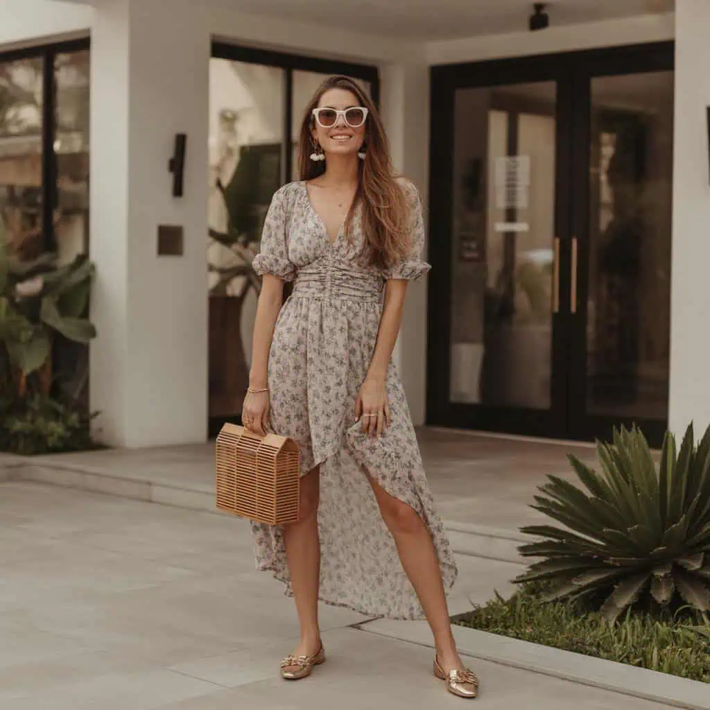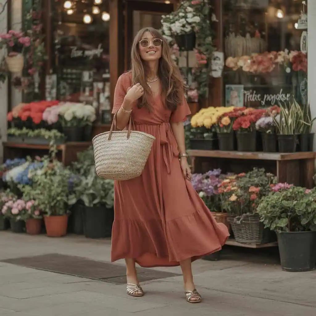Wrap dresses are a wardrobe staple for a reason—they naturally enhance your shape with their adjustable fit and flattering lines. This soft red midi dress emphasizes the waist while the flowing fabric allows movement without clinging too tightly. Flats elevate the outfit, lengthening the legs and adding a touch of sophistication. Accessorizing with chic sunglasses and delicate gold jewelry maintains a minimalist elegance, while a structured handbag adds a modern touch that balances the softness of the dress. Perfect for evening outings or casual brunches, this outfit pairs comfort with style, making it a go-to for anyone looking to feel fabulous on a warm day.