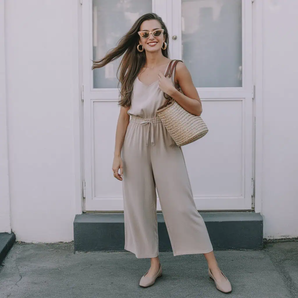 Opting for a head-to-toe neutral jumpsuit is an instant way to achieve a sophisticated and streamlined look. The tailored fit of this jumpsuit hugs the body in all the right places, emphasizing your shape without clinging too tightly. Cinching the waist adds definition and brings a polished finish to the outfit. Layering in oversized sunglasses and refined gold jewelry injects an air of effortless elegance, while the bag keeps the look refined. White sandals add a hint of brightness to the outfit while maintaining a cohesive color palette that elongates the legs, resulting in an effortlessly chic and flattering silhouette.
