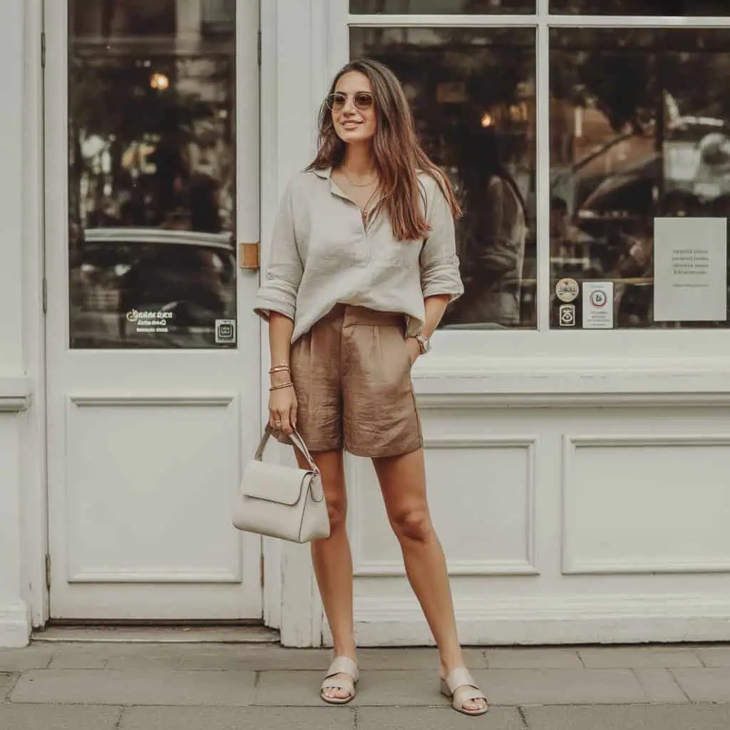 Embracing a monochrome palette effortlessly elongates your frame and lends an air of sophistication to your look. This relaxed beige linen set showcases how subtle variations in tones can add depth without overwhelming the eye. The fully tucked-in top draws attention to the waist, creating a beautiful hourglass silhouette while the tailored shorts complement with a slightly deeper shade. The oversized sunglasses and structured cream handbag inject a stylish essence, helping to break up the solid color while maintaining the overall cohesive vibe. Opting for neutral leather sandals keeps the look grounded and chic, completing the ensemble with effortless elegance.