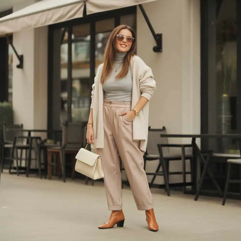 There’s an art to mixing neutrals, and this outfit is a masterclass in balancing tones and textures for a sophisticated, layered look. The light gray turtleneck offers a soft touch while the cream cardigan embodies easy elegance, perfect for transitioning between indoor warmth and outdoor crispness. Loose-fitting beige trousers bring a relaxed yet tailored aesthetic that allows for movement, while cognac leather ankle boots with a low block heel keep the look grounded and polished. Gold jewelry subtly elevates this ensemble, providing a hint of sparkle without stealing focus. This combination of layers not only brings practical warmth but encapsulates that effortlessly chic vibe so characteristic of Parisian style—ideal for brunch with friends or an afternoon of art appreciation.