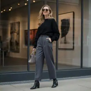 Simplicity speaks volumes in this chic ensemble that perfectly encapsulates Parisian elegance. The beauty of minimal jewelry lies in its ability to elevate an outfit without overwhelming it. In this look, a fitted black turtleneck serves as a sleek base, enhanced by a tailored gray blazer that adds structure and sophistication. The straight-leg gray trousers create a polished silhouette, while the beige leather ankle boots provide a modern twist with their pointed toe. Accessories like oversized sunglasses and a structured handbag not only make a statement but also embody the French aesthetic of understated glamour. This outfit demonstrates that less really can be more, leaving you feeling effortlessly stylish from morning coffee to evening art exhibitions.