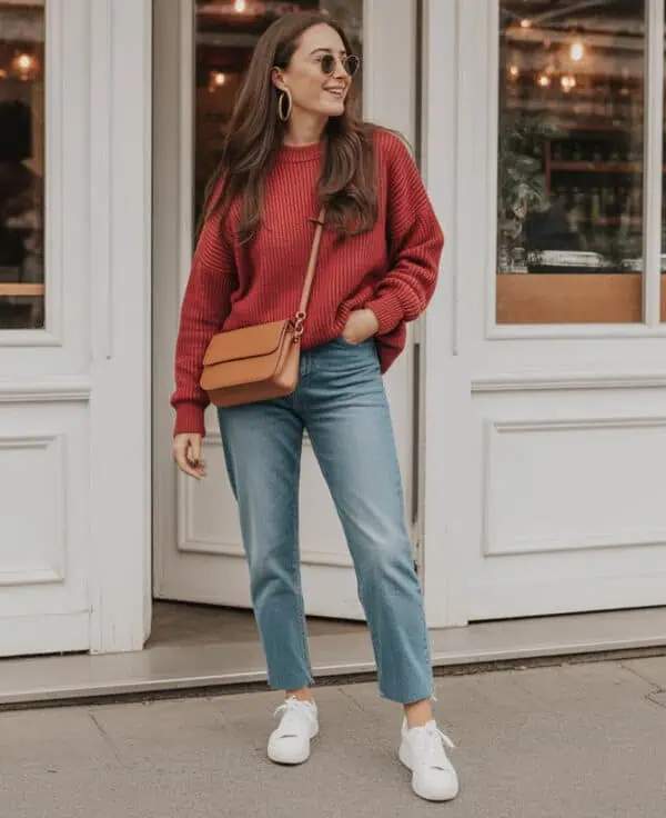 Pairing a cropped tee with wide-leg trousers is a playful yet chic way to embrace the transitional season. The cropped top introduces a sense of youthful energy, accentuating the waist beautifully, while the high-waisted wide-leg trousers contribute effortless sophistication. This silhouette not only elongates the legs but also allows for movement and comfort. A sleek leather belt cinches the waist, providing an intentional focus to the outfit. White flats keep it casual and clean, while classic accessories add a polished finish. Altogether, this look offers a stylish harmony that translates seamlessly from brunch to boardroom.